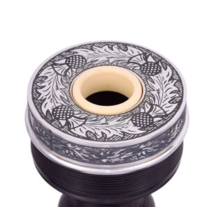 It also has a very cool blackwood blowpipe that is lined with plastic so it’ll never crack, and then this cool thistle-engraved nickel mouthpiece sleeve. Very, very cool. I also have these set up with my Perfect Angle Blowpipe Positioner.