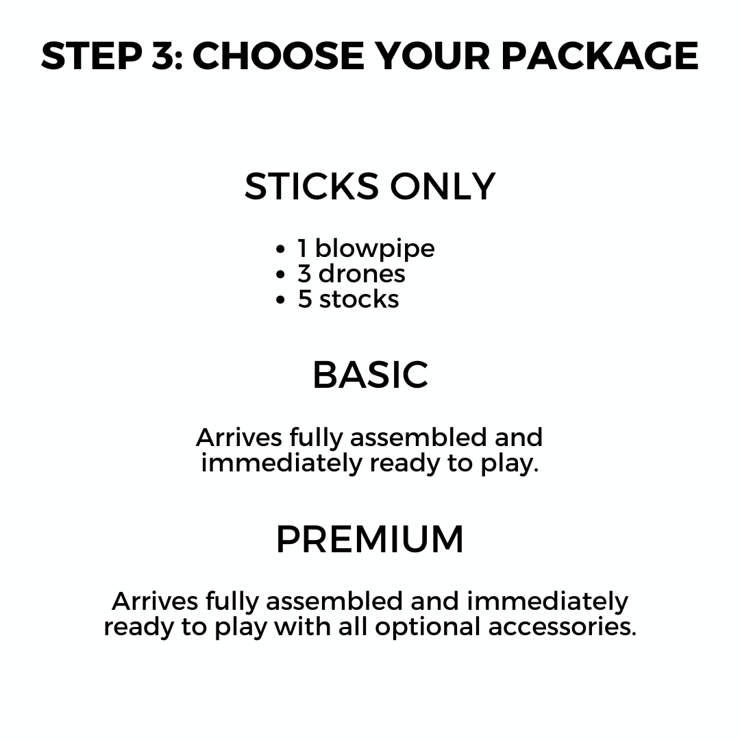 - Basic: Everything in Sticks Only and also Bannatyne Hybrid Pipe Bag, Bannatyne Bottle Water Trap, Ezeedrone Regular Drone Reed Set, Poly Infinity Pipe Chanter, Foundation Pipe Chanter Reed, Silk Drone Cords. Fully assembled and ready to play.