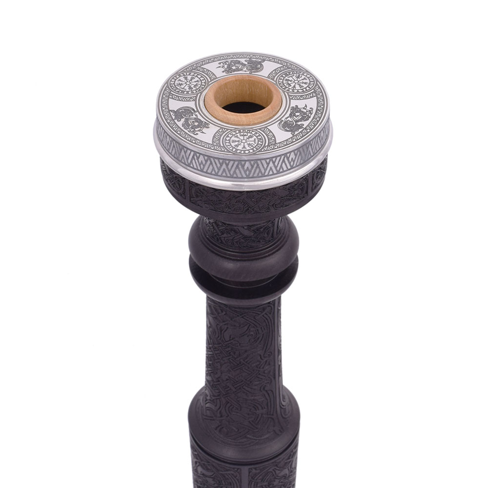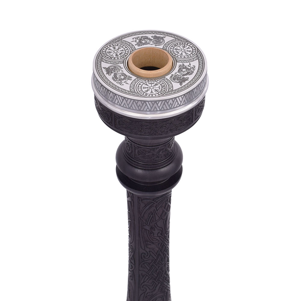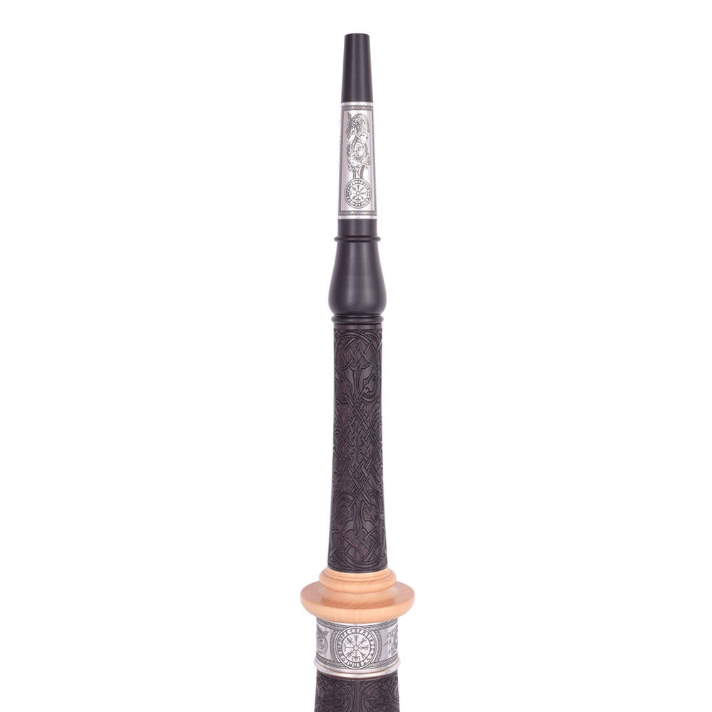 The Peter Henderson Viking Heritage Bagpipes are refined, high-quality instruments with a modernized, antique-style finish. Unlike traditional bagpipes, which feature combed and beaded wood, this set showcases a detailed, artistic finish that sets it apart. Each set includes a lined blackwood blowpipe, boxwood mounts, intricately engraved wood, engraved nickel, updated projecting mounts, and comes with a 5-year guarantee, blending tradition and innovation.